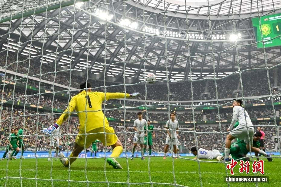 3月21日,在北京工人体育场进行的2026赛季中国足球协会超级联赛第三轮的比赛中,北京国安队主场1比1战平上海申花队。图为上海申花队守门员薛庆浩(中)在比赛中扑救。中新社记者 赵文宇 摄