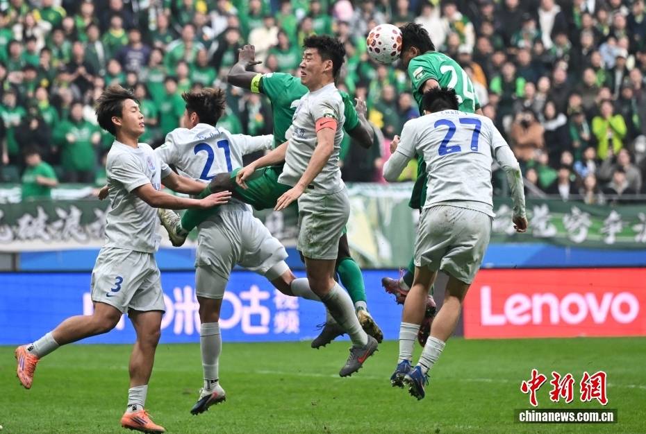 3月21日,在北京工人体育场进行的2026赛季中国足球协会超级联赛第三轮的比赛中,北京国安队主场1比1战平上海申花队。图为北京国安队球员阿不都海米提(右二)在比赛中争顶头球。中新社记者 赵文宇 摄